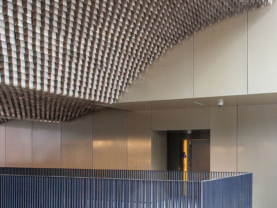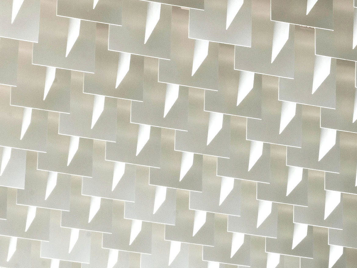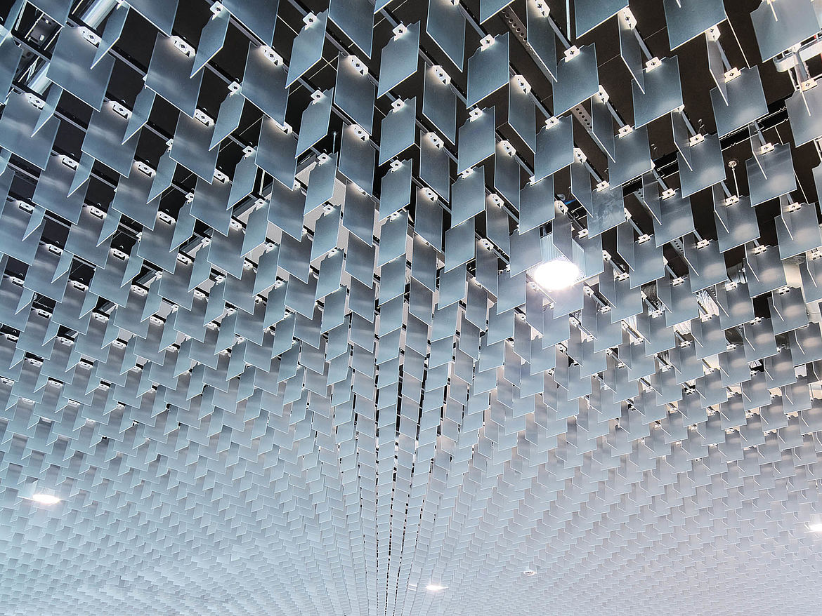 Das multidirektionale Raster LIVA überzeugt mit einem luftigen, homogenen Erscheinungsbild. In unterschiedlichen Höhen kombinierbar, bieten die rechtwinklig zueinander angeordneten Blattlamellen aus Aluminium viele Gestaltungsmöglichkeiten. Dadurch entsteht ein dynamisches Deckenbild, mit dem individuelle Akzente gesetzt werden können.