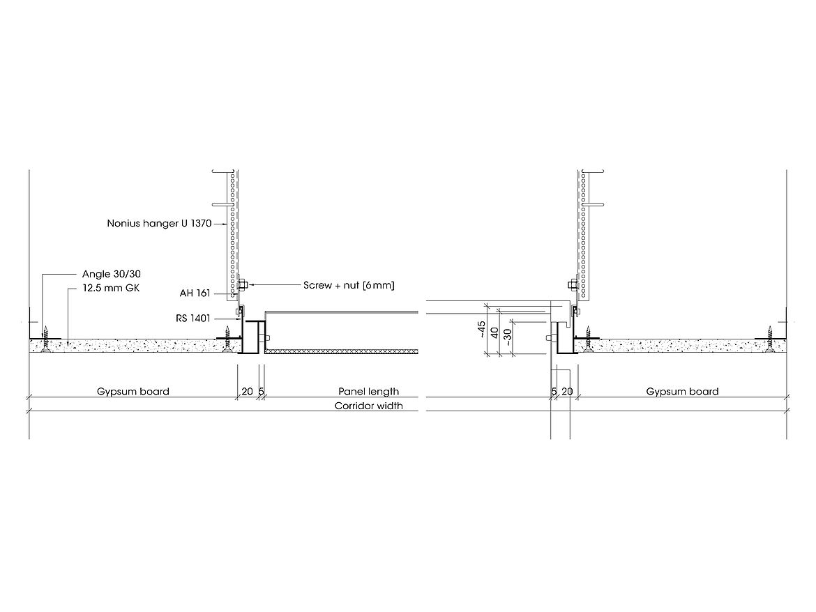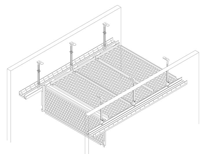 FS5.2FH RHOMBOS ist ein für den Einsatz in Flurbereichen konzipiertes Streckmetalldeckensystem. Da beide Elemente über ein gemeinsames Profil angebunden werden, eignet sich das abklappbare Auflagesystem optimal für die Kombination aus Metall und Gips. Das Ergebnis ist ein gleichmäßiges Deckenbild mit sichtbarer Unterkonstruktion.