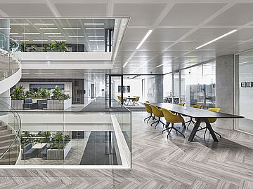 S5 Langfeldplatten in unterschiedlichen Abmessungen integrieren sich hervorragend in ihr ästhetisches Umfeld. Flexibel an dem parallel laufenden Bandrasterprofil befestigt, bietet das in schwarzgrau gepulverte System außerdem den Vorteil, die Raumaufteilung auch im Nachhinein zu verändern. Die eingesetzten Systeme sind nicht nur optisch ein Hingucker – durch die integrierte Kühlung sorgen sie außerdem für das richtige Klima am Arbeitsplatz.