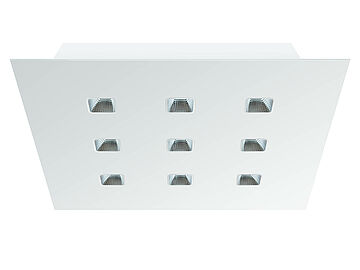 LED-Einbauleuchte aus quadratischen Reflektoren eingebaut in Gipskartondecke im Betriebsrestaurant, Lichtfarbe 2.700 – 4.000 K, DALI dimmbar [119 Stk.]