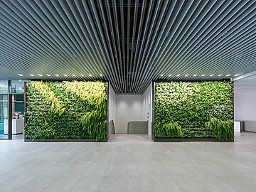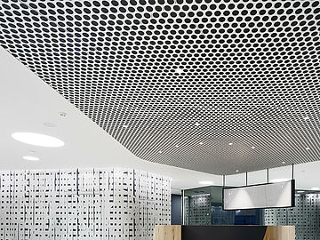 Die zeitlose Metalldecke GEO in der Lobby der neuen Residenz betont mit ihren großen Rasterzellen die Offenheit des Raumes und schafft ein einladendes Ambiente. In der Gartenlobby des oberen Stockwerks komplementiert das lineare Vertikallamellensystem POLYLAM die natürliche Atmosphäre der Umgebung und lädt neben dem pflanzenreichen Innenatrium zum Verweilen ein.