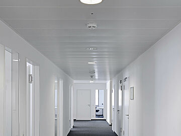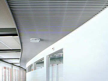 Besondere Akzente setzen die eingesetzten Deckensysteme STARLAM, die sowohl im Innenbereich als auch im Außenbereich zum Einsatz kamen und mit ihrer offenen, dekorativen Struktur eine klare, strukturierte Gestaltung erzeugen. Kundenspezifisch in RAL 9006 und Pearlgold RAL 1036 ausgeführt, unterstreicht die akzentuierte Linienführung das architektonische Konzept. Ergänzend kamen in den Fluren FF2025 Einlegesysteme zum Einsatz, die mit hinterlegtem Akustikvlies für optimale Raumakustik sorgen und zugleich ein durchgängiges Erscheinungsbild mit hoher technischer Präzision schaffen.