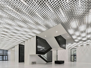 Das weitläufig und offen anmutende Erdgeschoss erhält von allem durch das strahlend hell gepulverte Einstegraster QUADRA® Dekor seine besondere Anmutung. Die eigens für dieses Projekt konzipierte Sonderausführung besteht aus versetzt angeordneten, wellenförmigen Rasterelementen. Ungleichmäßig groß perforiert, unterstützt die Rasterdecke nicht nur die Lichtstreuung, sie ergibt auch ein in sich sehr heterogenes Deckenbild.