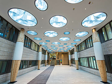 Auf der Nordseite des Gebäudes verwandeln fünf in die Decke eingelassene LIGHT PIPES von durlum den langen Verbindungsgang zur Cafeteria ebenfalls in einen hellen, tageslichtdurchfluteten Ort. Fresnel-Ausblendlamellen am oberen Ende der LIGHT PIPES sorgen für eine gleichmäßige Ausleuchtung und machen den Flurbereich zu einem angenehmen Aufenthaltsort in den Pausen.