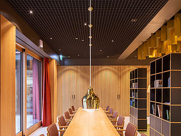 Für das neue Design lieferte durlum mit QUARDA die passende Deckenlösung. Das Einstegraster verleiht dem Raum einen leichten, luftigen Charakter. Das oberhalb der Decke installierte Licht von Lichtvision Design lässt sie geradezu immateriell wirken, so dass sie einen Kontrast zu den mit natürlichem Lehm verputzten Wänden und den massiven Möbeln aus Sedimentgestein bildet.