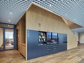 Die multidirektionale Rasterdecke PYTHA fällt durch ihr gleichmäßiges und ästhetisch ansprechendes Deckenbild besonders ins Auge. Die in weiß bandlackierte Decke, die sich aus gleichseitigen Dreiecken zusammensetzt, bietet zahlreiche dekorative Kombinationsmöglichkeiten. Je nach Blickwinkel und abhängig von den Lichtverhältnissen zeigt sich beim Betrachten der Decke jedes Mal ein anderes Deckenbild mit den unterschiedlichsten visuellen Effekten. Die Decke ist mit einer integrierten Trageschiene ausgestattet und erzeugt ein homogenes Deckenbild. So wird das Lesen in der Bibliothek zu einem besonders angenehmen Erlebnis.