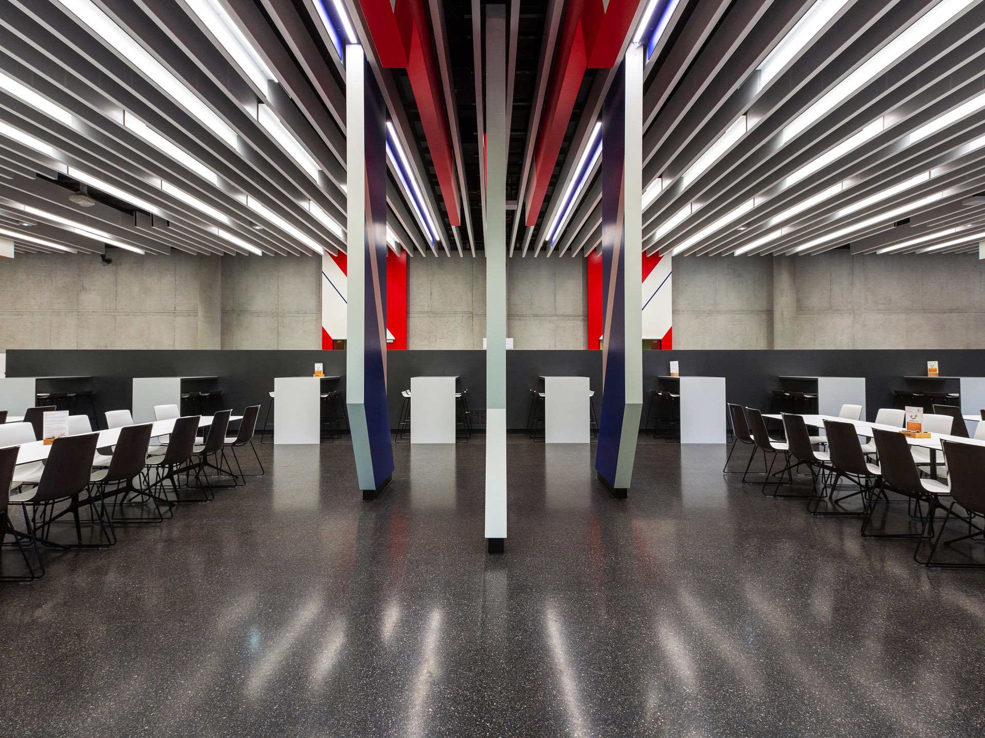 Bright, light-filled rooms with plenty of natural light promote well-being and help pupils to relax. To complement natural light, a balanced, shadow-free and glare-free lighting scheme is recommended, ideally controlled via a lighting management system. DIN EN 12464-1 specifies a minimum illuminance of 200 lux for school canteens. However, counters, tills and serving areas should have their own lighting design, offering a higher illuminance level and high colour rendering to ensure food is presented attractively.