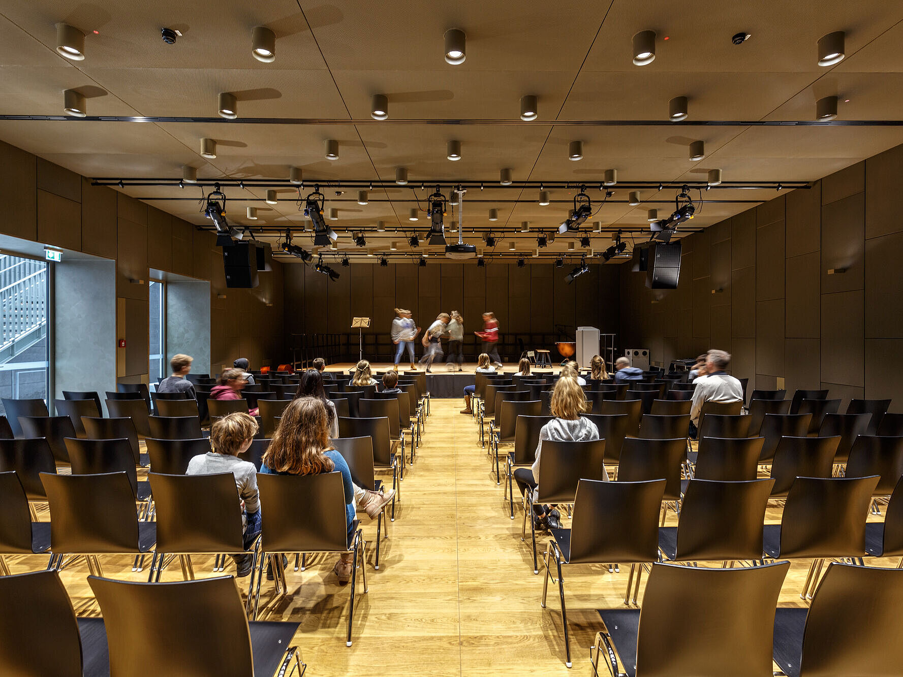 The assembly hall is usually the largest room in schools and – much like lecture theatres and auditoriums at universities – is used for a wide variety of purposes. This requires a particularly flexible lighting system. Lecture halls and auditoriums with fixed, flat or slightly sloping seating can generally be lit in the same way as normal classrooms. However, where seating slopes steeply, more careful planning is required to ensure uniform illuminance and avoid glare.