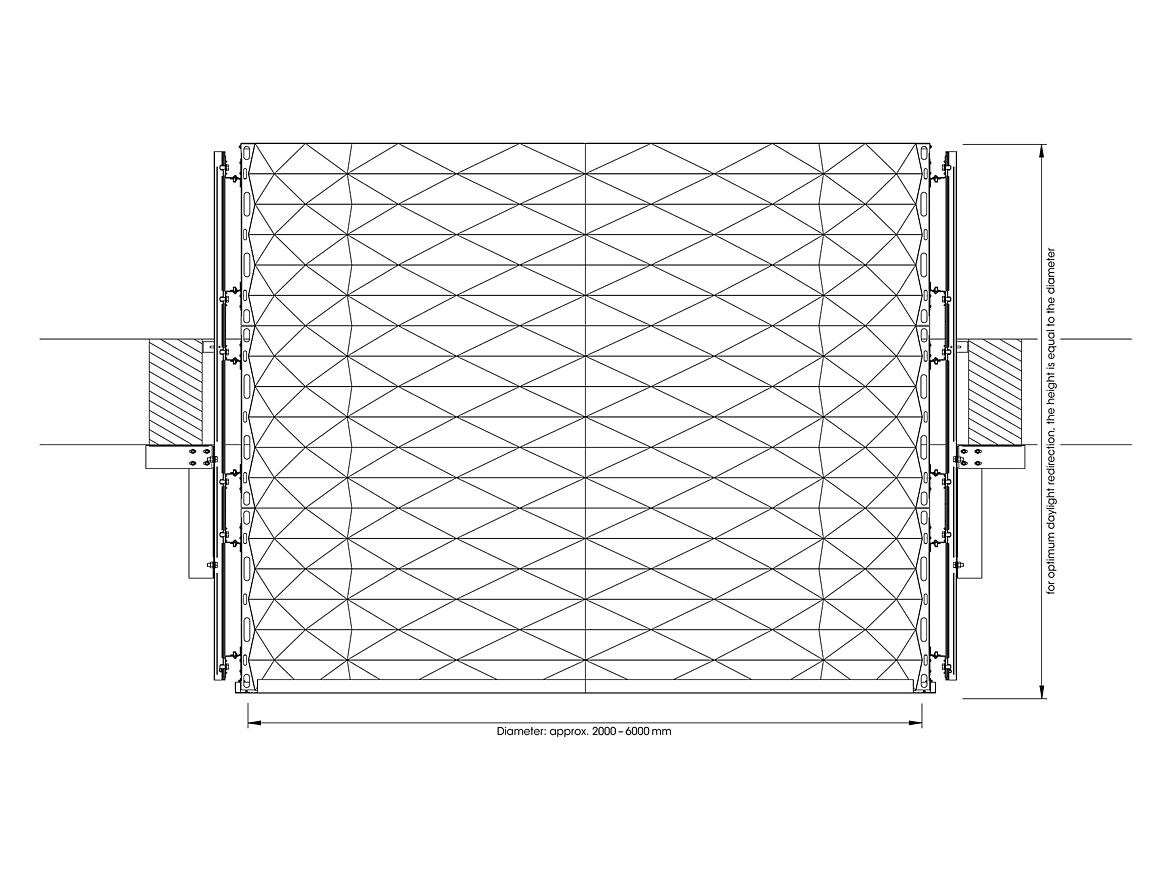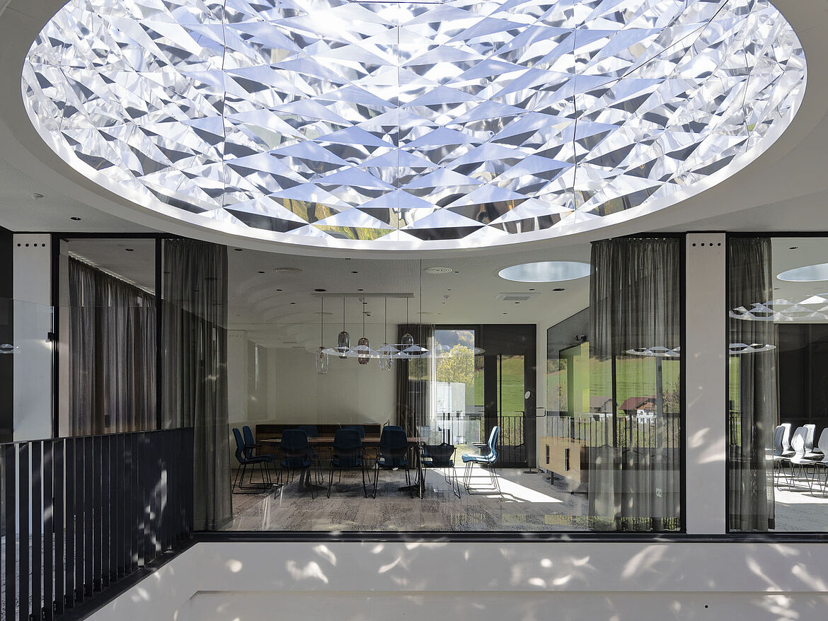 The DIAMOND TUBE daylight system does not need to be regulated with blinds etc., but still brings a lively dynamic into the room. Consisting of numerous isosceles triangular elements in highly reflective aluminium, it effectively directs incoming daylight into the room.