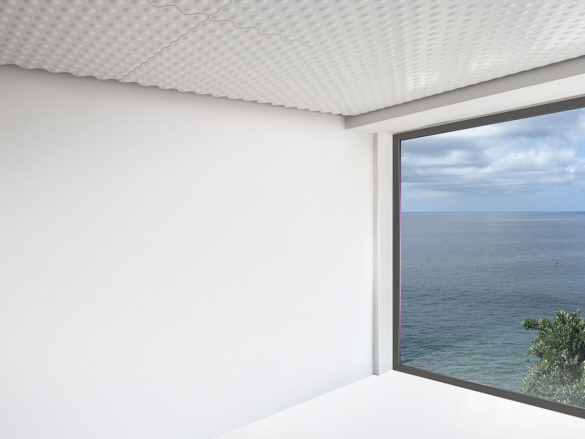 Characteristic for this elegant metal ceiling are its typical convex shapes which give the ceiling a three-dimensional look and provide a wide range of design options. BUBBLE can also be used as a cooling ceiling and adapted to various acoustic requirements.