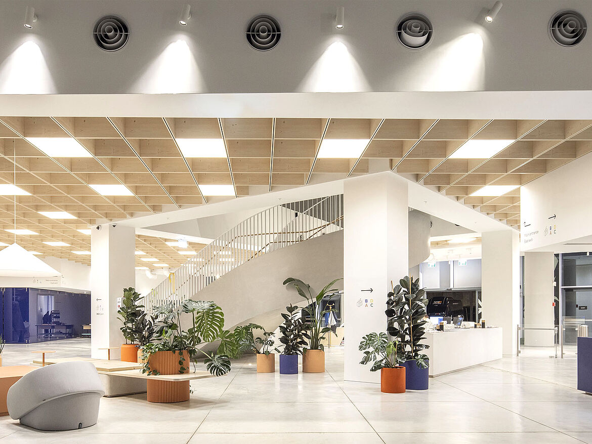 This linear, open baffle ceiling offers a versatile range of design options and can be used as a cross pattern or as a cooling ceiling POLYLAM dur-COOLTEC. Through the number, size and perforation of the louvres, and through a range of different fillers, POLYLAM can satisfy demanding acoustic requirements. Printed in a wooden look (dur-GRAPHICS), phenomenal creative options are possible.
