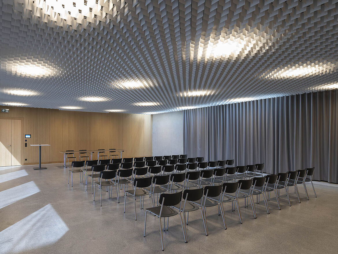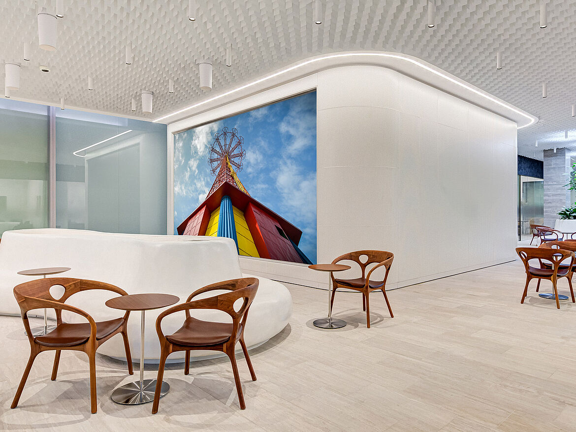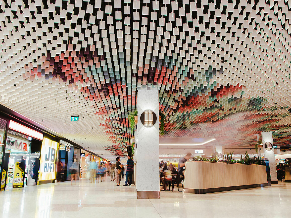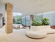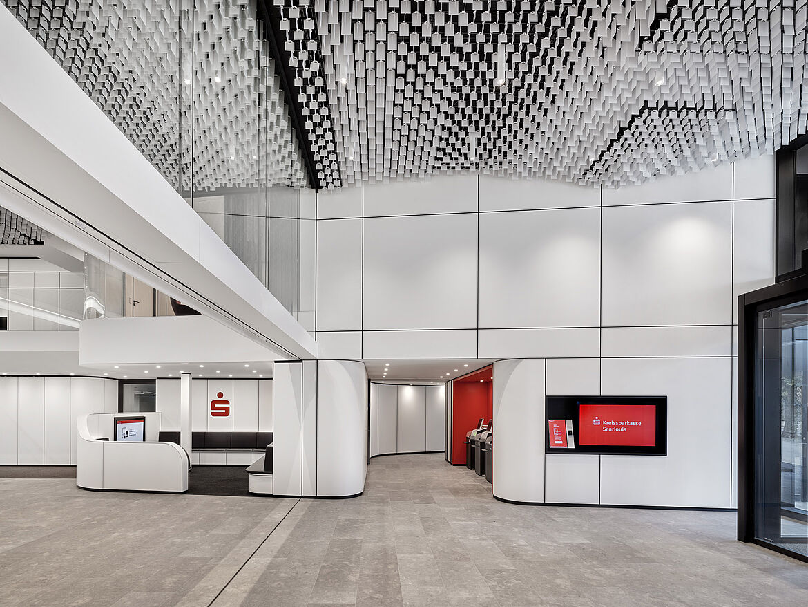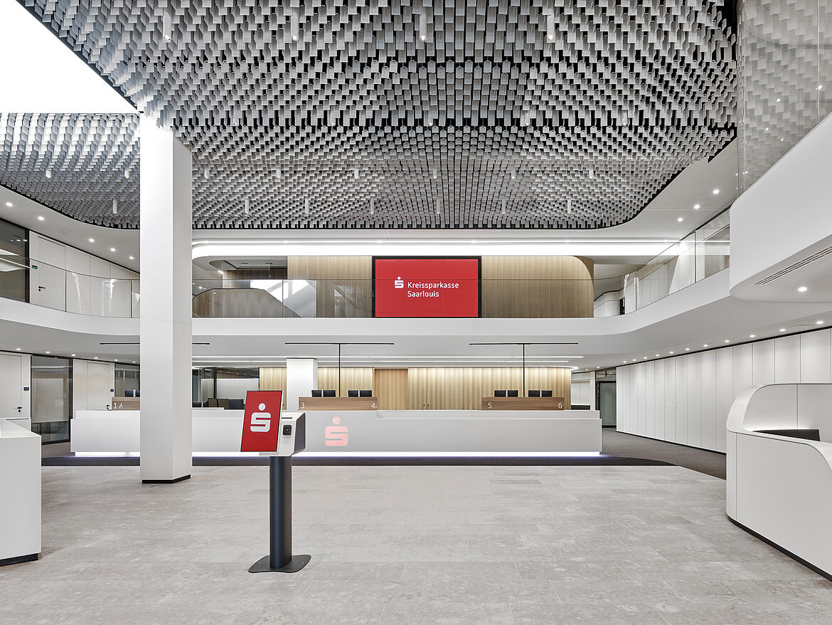 The LIVA multidirectional open-cell ceiling has a compellingly airy, homogeneous appearance. Combinable at different heights, the aluminium louvres, arranged at right angles to one another, create many design options. This generates a dynamic appearance of the ceiling in order to set individual accents.