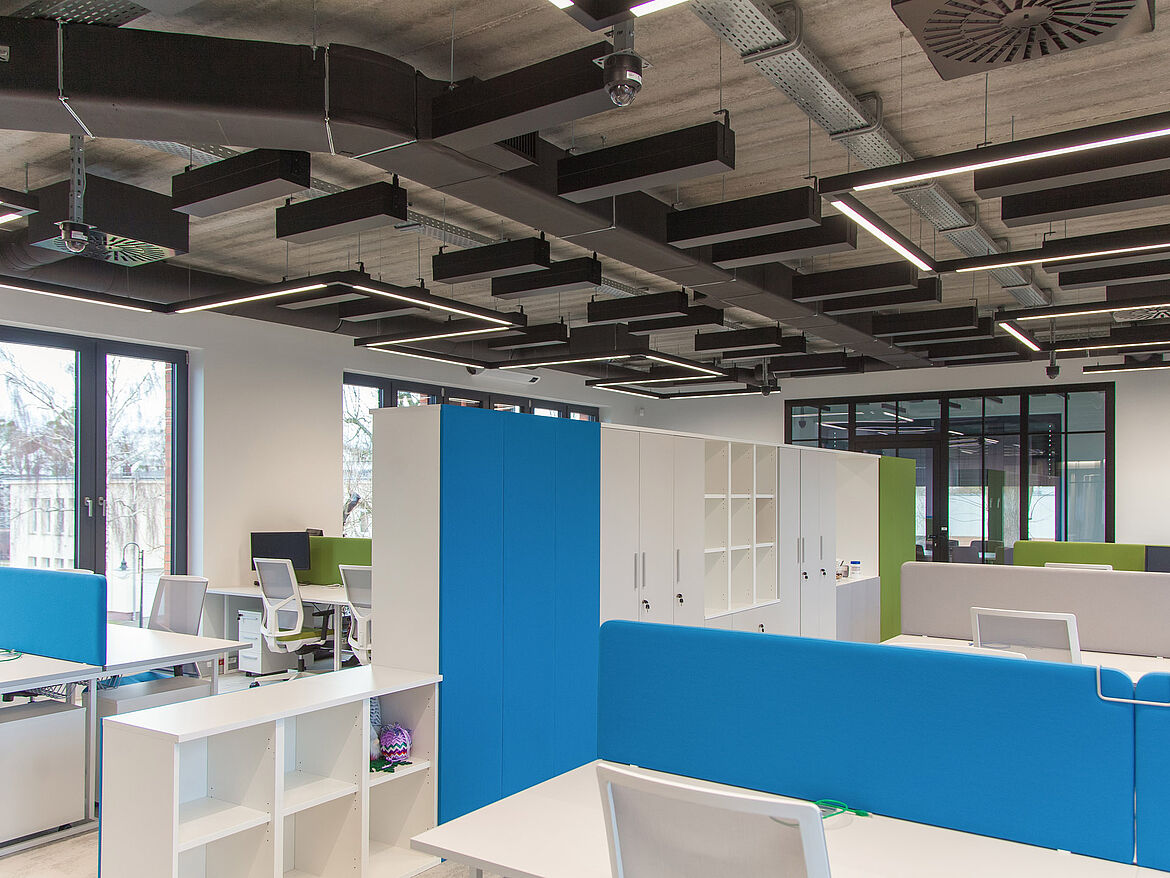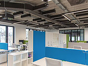 dur-SONIC CUBE was developed to fulfil acoustic requirements in rooms with open ceilings [for example: open cell ceilings, expanded metal ceilings, LOOP]. The attainable sound absorption effect depends on the density of the elements deployed. Due to the high absorbency of a single dur-SONIC CUBE element a good effect can already achieved at low densities. NRC-values of up to 0,85 can be obtained. Thereby a rigid arrangement of the elements is not necessary. The elements can be placed unobtrusively wherever there is room to be found in the ceiling void.